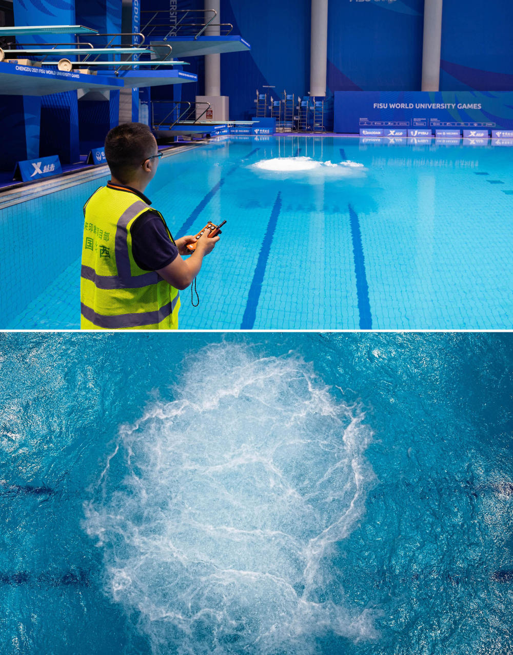 跳水池安全保护气浪(垫)的技术要求 1.作用 由安装在跳台、跳板正前方池底的供气环管迅速喷出洁净的空气,使池水产生一个气-水混合的“气浪垫”,以防止跳水人员动作失误或练习新的跳水空中姿态等造成的安全伤害,以及消除初学跳水人员客服恐惧心理,为他们提供一个安全活动的环境。 2.原理 安全保护气浪(垫)是在跳水人员离开跳台、跳板自由落下至落入水中这个时间段内,池底供气环管迅速向水中输入压缩空气,使池水运动而在池水表面产生一个均匀的水与气泡相结合的“气浪(垫)”称之为即时安全保护气浪(垫)。 3.安全保护气浪(垫)的设置原则 1)教学和训练用的跳水池应设置安全保护气浪(垫)。 2)3.0m高度的跳板和5.0m、7.5m、10.0m高度的跳台,应在其正前方设置安全保护气浪(垫)装置。 3)安全保护气浪(垫)装置应采用环形官网供气方式,以确保能产生一个均匀的气水混合的气浪(垫)。 4)环形供气管应布置在跳台、跳板在池底水平投影的正前方0.5m处。 5)安全保护气浪(垫)的平面尺寸,应根据跳台、跳板上的表面距池水水表面的垂直高度按下列规定确定: (1)跳板高度为3.0m时,环形供气管布置应为宽1.0m*长3.5m; (2)跳台高度为5.0m及7.5m时,环形供气管布置应为宽1.0m*长4.5m; (3)跳台高度为10.0m时,环形供气管布置应为宽2.5m*长5.0m; 4.环形供气管的构造及材质 1)环形供气管应为网格状环形状; 2)环形供气管上应每隔300mm间距设置内径为8mm的喷气嘴,喷气嘴总数量不应少于40只; 3)环形供气管喷气嘴应采用高强度、耐腐蚀、阻力小、不变形的不锈钢管或铜管等材质。耐压等级不应低于1.6MPA. 5.环形供气管及池底喷气制波管的敷设 1)应埋设在池底板与池底饰面层的找平层内; 2)垫层厚度不应小于300mm。 6.安全保护气浪(垫)系统组成 1)由空气压缩机、高效冷却器、冷冻干燥机、油水分离器、活性炭吸附器、储气罐、供气管、供气环管、喷气嘴及控制箱等组成。 7.安全保护气浪(垫)设置要求 1)安全保护气浪(垫)的设备机房应靠近跳水池设置在跳板(台)一侧,使其敷设管路最短,阻力损失最小,供气时间最快。 2)安全保护气浪(垫)系统应确保一经启动,气浪形成时间不超过3s,气浪持续时间不少于12~15s,才能达到保护作用。 |